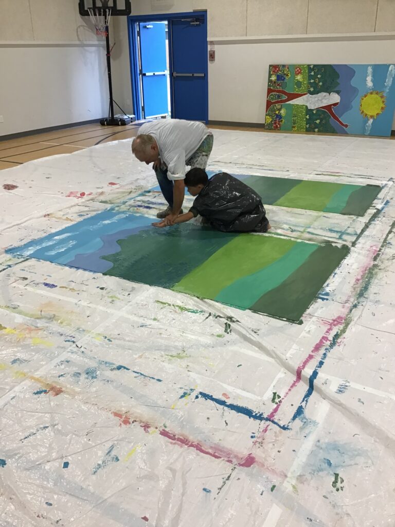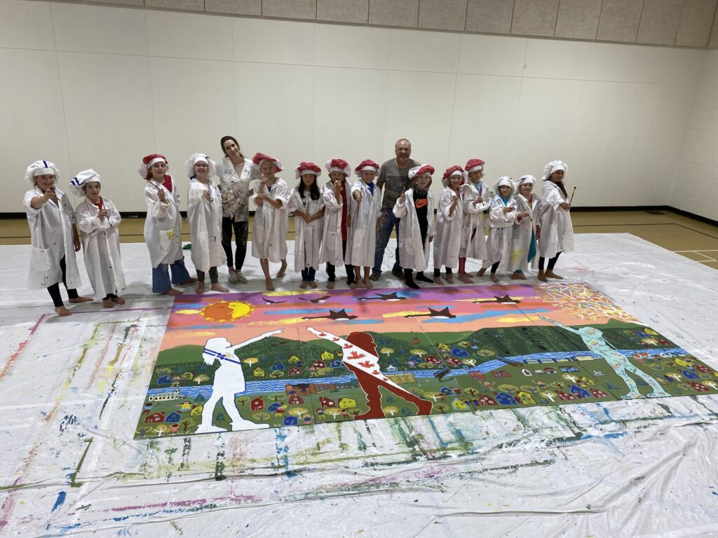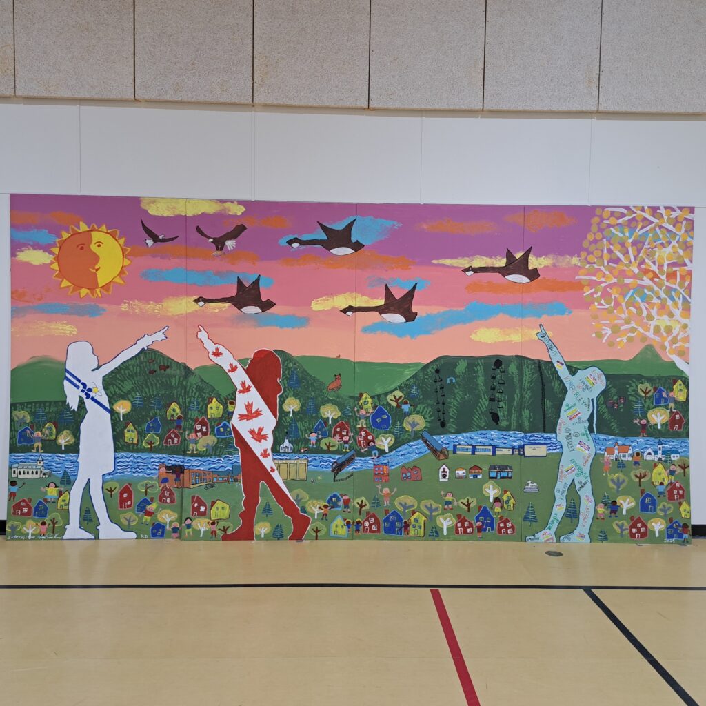 À Golden, sur les territoires des Nations Secwépemc et Ktunaxa, l’école La Confluence a vécu une expérience similaire quelques jours plus tôt, portée par la même volonté de rapprocher les communautés à travers l’art. À La Confluence, les élèves ont collaboré avec l’école anglophone Nicholson Elementary school  Là aussi, l’artiste invité s’est inspiré des paysages emblématiques de la région, les rivières, les plaines, les reliefs, pour imaginer une fresque que les élèves ont ensuite fait naître.