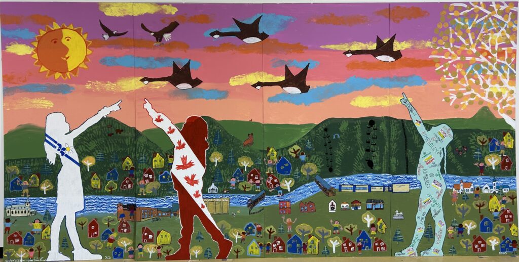 Les classes ont peint le fond de l’œuvre, puis les élèves ambassadeur·rice·s ont ajouté des éléments inspirés de la faune locale, des symboles choisis par les jeunes et des silhouettes d’élèves représentant la rencontre entre les langues, les cultures et les histoires qui traversent Golden. Cette murale, elle aussi conçue pour être installée de façon permanente, deviendra un symbole visuel d’ouverture, de collaboration et de créativité, soulignant le rôle essentiel de l’école La Confluence dans la vitalité culturelle de la ville et l’affirmation de la langue française en milieu minoritaire.