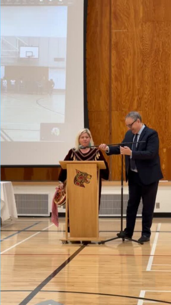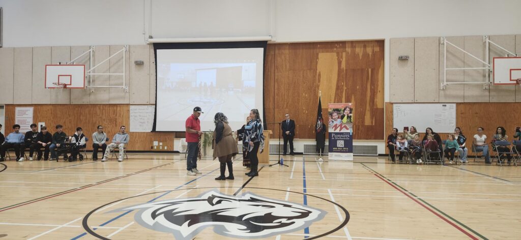 Bien plus qu’un geste symbolique, cette cérémonie constitue un acte de partage profondément ancré dans les traditions, la spiritualité et les enseignements de la Nation, transmis à la communauté scolaire dans un esprit de relation, de respect et de continuité. La cérémonie s’est déroulée en présence d’élèves, de membres du personnel, de familles et de représentant·e·s de la Nation Kwikwetlem.