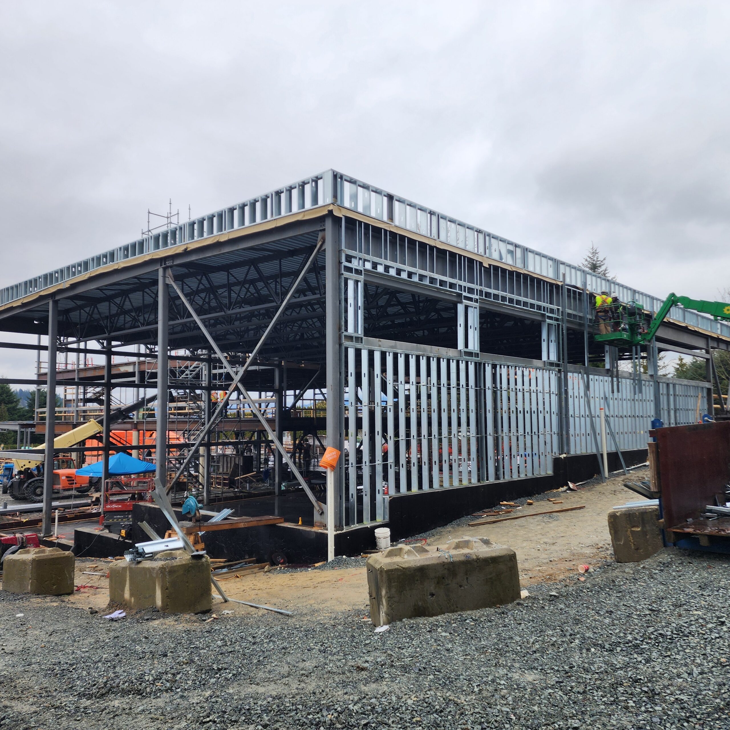 L’installation de la charpente en acier est en cours. Les travaux de bétonnage de la dalle sur terre-plein sont en cours.