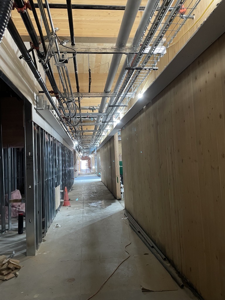 À l’intérieur, les équipes installent les montants d’acier, terminent les pré-installations et préparent les cloisons. À l’extérieur, les travaux se poursuivent avec l’application de la membrane du bâtiment.